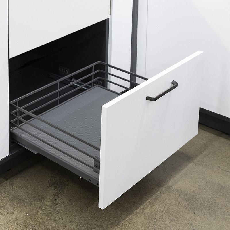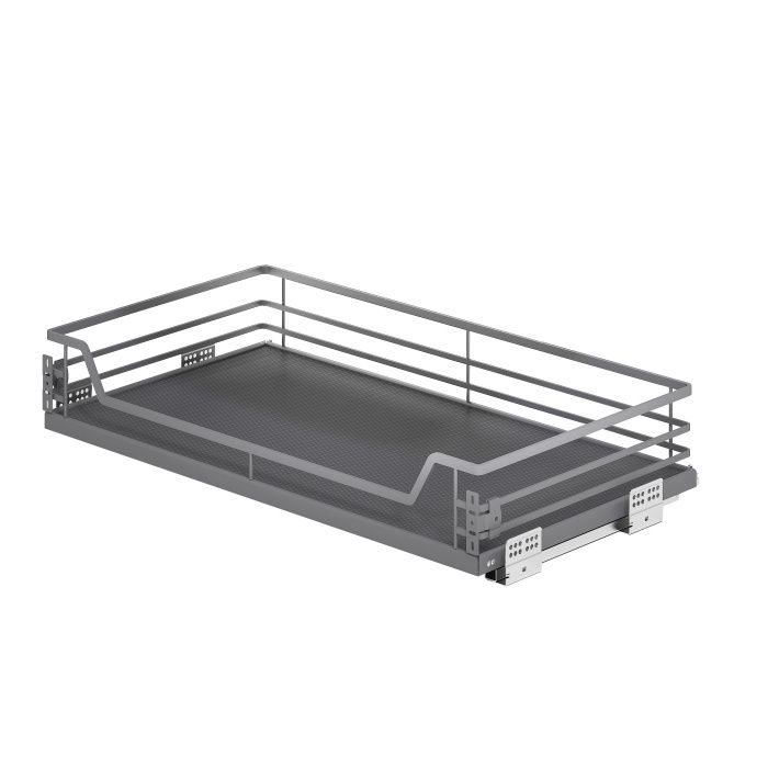 Выдвижные корзины FOCUS премиальное решение для организации хранения на кухне: -современный дизайн, стильный, лаконичный внешний вид в матовом графитовом цвете, -толстый надежный прут, стальное дно из листового металла, жесткая сварная конструкция, качественные сварные швы (лазерная сварка), --эпоксидно-полиэфирное покрытие, -в корзине предустановлено противоскользящее покрытие, -направляющие скрытого монтажа с доводчиком PRIME by AKS полного выдвижения с нагрузкой до 25 кг (рекомендованная нагрузка на корзину 20кг), -съемное крепление к фасаду (возможна установка в ящик под выдвижной и распашной фасад), -в корзине установлен комплект быстрого монтажа направляющих, предусмотрена подробная инструкция и шаблон для быстрой и легкой установки, -подходит для ящика как с ДСП 18 мм, так и с ДСП 16 мм. Продуманная конструкция корзин помогает организовать хранение столовой посуды, продуктов на кухне. В комплекте: -стальная корзина с противоскользящим ковриком (графит) - 1 шт, -комплект направляющих скрытого монтажа с доводчиком PRIME by AKS - 1 компл, -комплект пластиковых вставок для ДСП16, -комплект быстрой установки направляющих (установлен в корзине), -комплект креплений к фасаду, -комплект крепежей, -шаблон для установки PRIME by AKS - 1 шт, -брендированная инструкция PRIME by AKS - 1 шт.Технические характеристики: