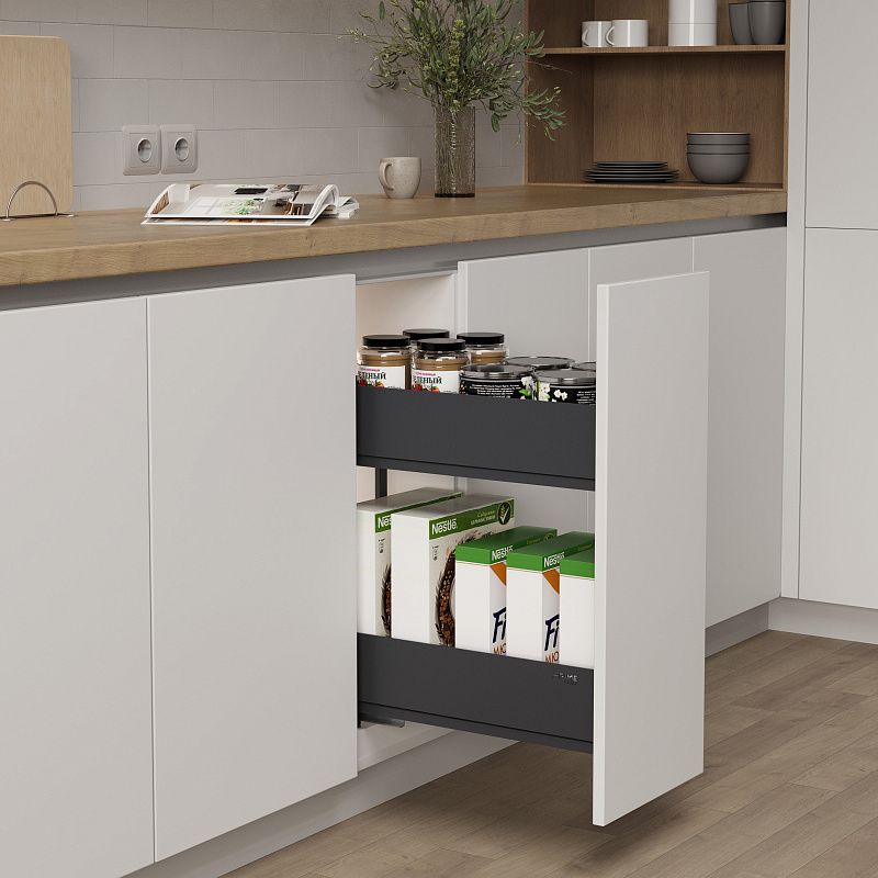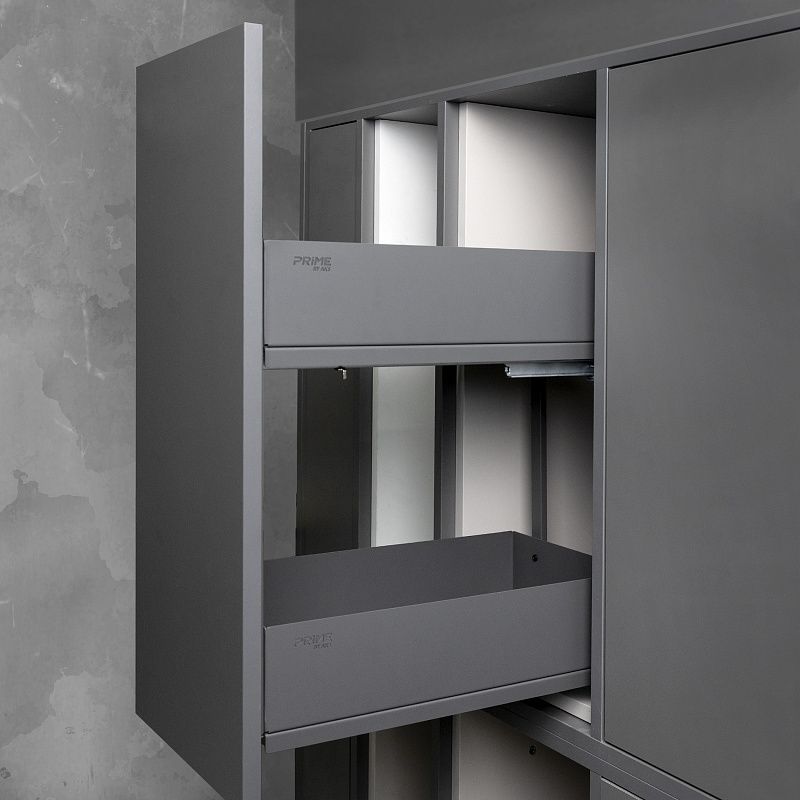 Выдвижные корзины-карго ICON премиальное решение для организации хранения на кухне: - максимальное использование внутреннего пространства ящика, - стильный дизайн в графитовом цвете, жесткая конструкция, качественные сварные швы (лазерная сварка), - сталь толщиной 1,3 мм, цельнолистовое дно, - эпоксидно-полиэфирное покрытие, - для более жесткой фиксации корзины рекомендуется диагональное крепление направляющих к ящику, - съемное крепление к фасаду с регулировкой в трех плоскостях (возможна установка в ящик под выдвижной и распашной фасад), - крепления корзины-карго к направляющим скрыты под противоскользящим покрытием, - направляющие скрытого монтажа с доводчиком PRIME by AKS полного выдвижения (60000 циклов, 25кг), - рекомендованная нагрузка на корзину - 20 кг. Продуманная конструкция корзин помогает организовать хранение бутылок, банок, столовой посуды, продуктов на кухне. В комплекте: - корзина с лого PRIME by AKS - 1 шт, - корзина без логотипа - 1 шт, - противоскользящее покрытие с клейким слоем - 2 шт, - комплект направляющих скрытого монтажа с доводчиком, - комплект соединителей для корзин c крепежами, - комплект креплений к фасаду, - комплект крепежей, - шаблон для установки, - инструкция.Технические характеристики:
