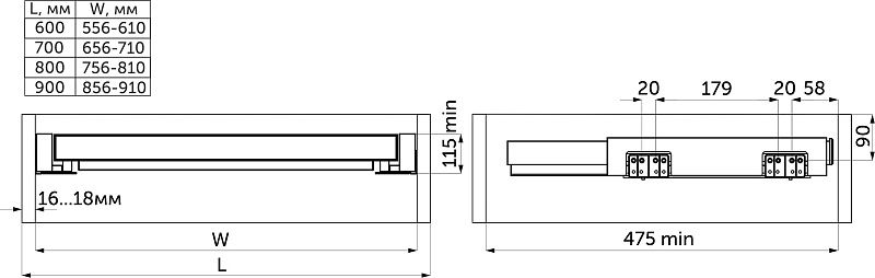-крепление: боковое;-материал: сталь + пластик;-цвет: графит;-покрытие: экокожа;-размеры: 558-570x475x58 мм;-нагрузка: 10 кг;-направляющие: L-450 мм скрытого монтажа полного выдвижения с доводчиком (max нагрузка на направляющие - 25 кг);-назначение: для хранения аксессуаров (часов, бижутерии, платков, галстуков, бабочек, запонок и пр. ); -индивидуальная брендированная упаковка, шаблон для установки, инструкция, необходимый крепёж.Технические характеристики: