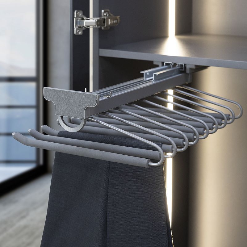 -крепление: верхнее;-материал: сталь + пластик;-цвет: графит;-покрытие: противоскользящее;-нагрузка: 8 кг;-направляющие: L-450 мм скрытого монтажа полного выдвижения с доводчиком (max нагрузка на направляющие - 25 кг);-назначение: для хранения одежды (брюк, шорт, юбок), ремней и пр. (9 прутьев); -индивидуальная брендированная упаковка, шаблон для установки, инструкция, необходимый крепёж и заглушки.Технические характеристики: