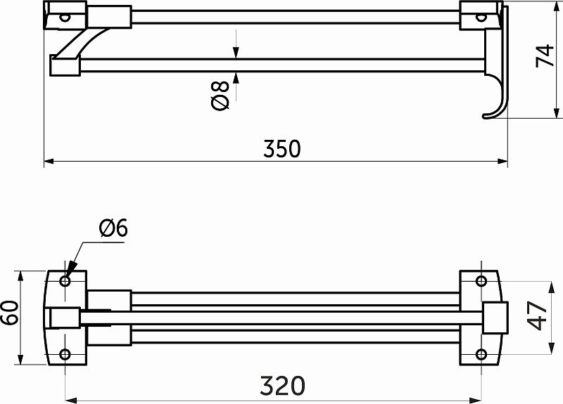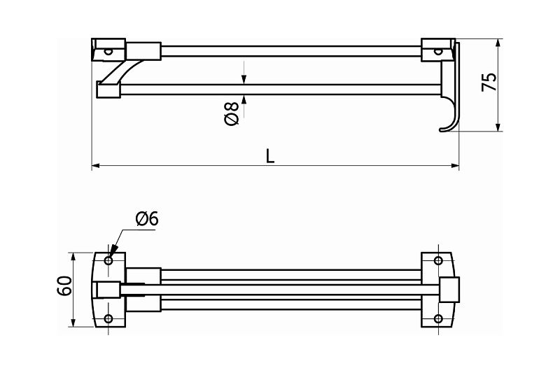 Вешалка изготовлена из цельнометаллического прута d8мм. Крепиться на горизонтальные поверхности. Используется для размещения вешалок-плечиков с одеждой.Технические характеристики: