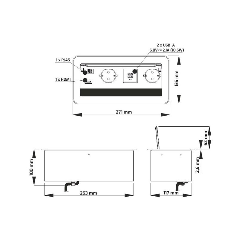 Наружный размер 271х136мм, монтажный размер 117х253мм, степень защиты IP20, длинна кабеля 1,5м, электробезопасность 16A с заземлением и проводами с поперечным сечением 1,5 mm². тип гнезда: Schuko, USB-C + USB-C x 5V DC 2,1A, HDMI, LAN, провод 1. 5мТехнические характеристики: