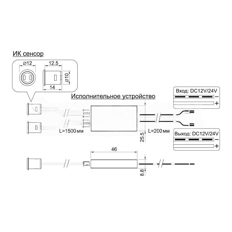 Инфракрасный выключатель DD-2 предназначен для автоматического управления освещением в двухдверных шкафах. Работает от 12/24В и поддерживает нагрузку до 60Вт (12В) и 100Вт (24В), что делает его идеальным для светодиодного мебельного освещения. Выключатель можно установить встраиваемым или накладным способом, это позволяет легко интегрировать его в любую мебель. Датчики соединены с блоком управления проводом длиной 1,5 метра, с установленными на них коннекторами, которые легко отсоединить от блока управления для монтажа датчиков в мебель. Монтаж удобен и прост. Устройство имеет 2 способа установки: 1-й способ. ИК сенсоры устанавливается в монтажное отверстие D=10 мм. При этом кабель прокладывается в монтажное отверстие. 2-й способ. ИК сенсоры устанавливается на поверхность с помощью держателя. • Соедините выход ИК выключателя с источником света и подключите вход ИК выключателя к источнику питания постоянного напряжения 12 В …24 В.Технические характеристики: