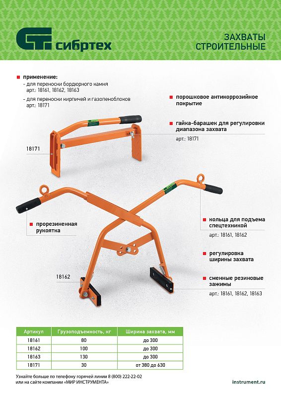 Ручной захват для бордюрного камня Сибртех 18163 — удобный и надежный инструмент, применяемый для установки дорожных бордюров, поребриков, бортового камня массой до 130 кг.