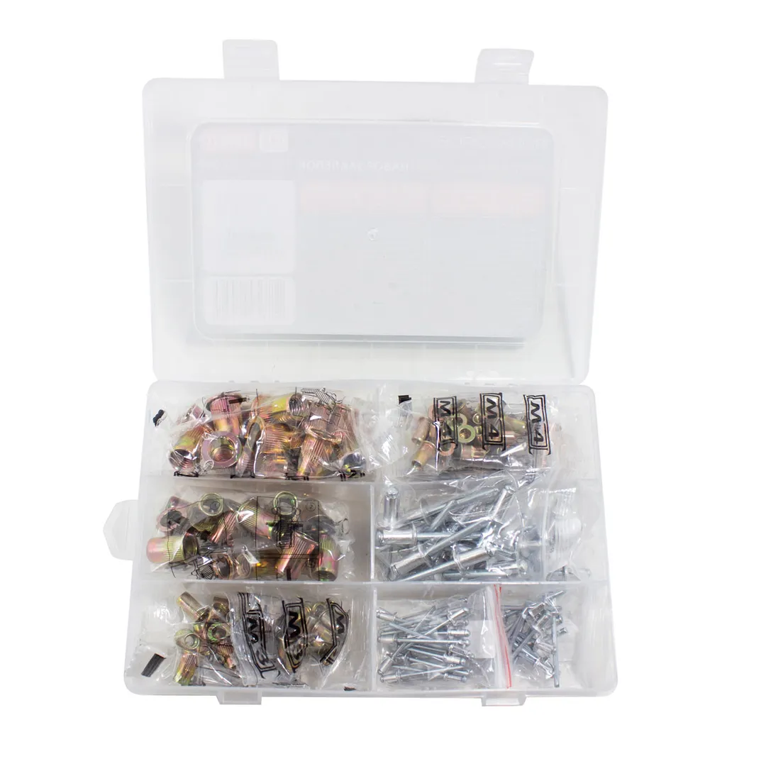 Набор заклепок комбинированный 165 предметов в кейсе. Гаечные резьбовые вставки втулки бонки, винтовые заклепки для заклепочника представляют собой крепежные элементы в виде втулки с опорным бортиком в верхней части и резьбой в нижней. Верхняя часть выполнена в виде тонкостенной трубки без резьбы и имеет продольную наружную насечку. В процессе монтажа она деформируется. Вертикальная насечка на верхней части обеспечивает равномерную деформацию и предотвращает разрыв материала. Резьбовые заклепки применяются обычно для соединения листовых материалов. Заклепки вытяжные алюминиевые – крепежные изделия для механического соединения двух и более деталей. Подходят для скрепления металла, древесины, пластмассы, кожи. Вытяжные заклепки удобны тем, что для их установки необходим доступ к скрепляемым поверхностям лишь с одной стороны. Использование заклепок при монтаже различных конструкций дает возможность профессионалам существенно сократить время работы. Комплектация: вытяжные заклепки: 2.4, 3.2, 4.0, 4.8, 6.4мм - по 15шт; резьбовые заклепки: М3, М4, М5, М6, М8, М10 - по 15шт.Преимущества работы с нами