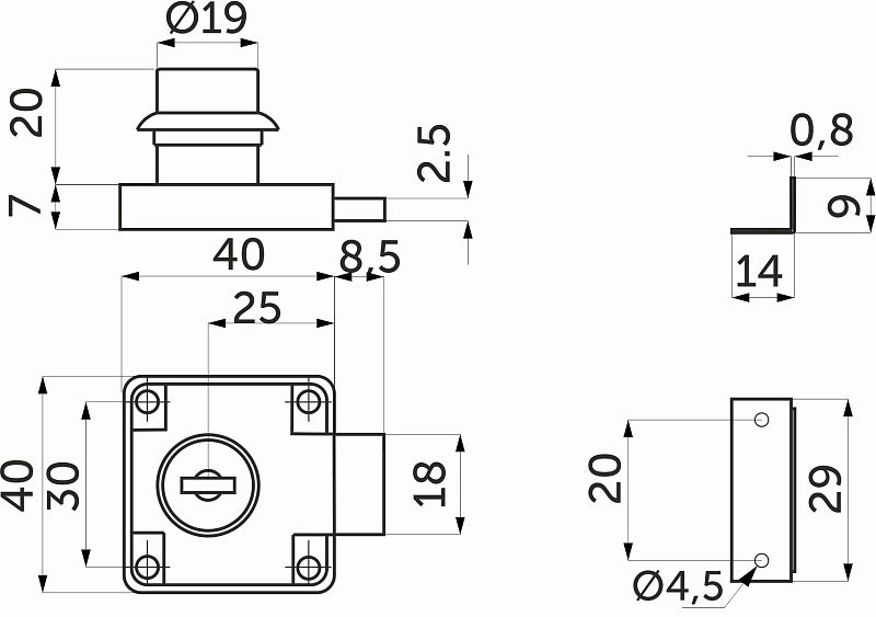Данная модель является наиболее популярной среди мебельных замков. Замок предназначен для деревянных, ЛДСП, МДФ - фасадов толщиной 16-18 мм. Для монтажа данного типа замков необходимо высверлить отверстие для личинки цилиндра, сам же корпус замка крепится саморезами с обратной стороны фасада. С лицевой стороны фасада к замку монтируется декоративная накладка.Технические характеристики: